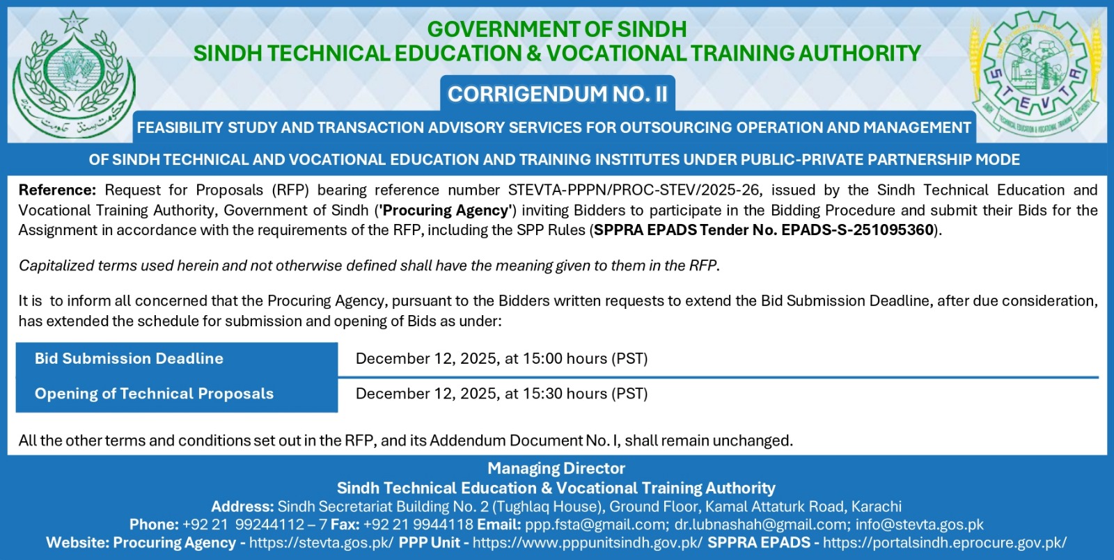 CORRIGENDUM NO. II Feasibility Study And Transaction Advisory Services For Outsourcing Operation And Management Of Sindh Technical And Vocational Education And Training Institutes Under Public-Private Partnership Mode